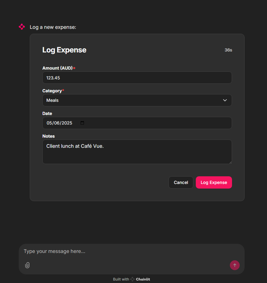 - Agent calls a consent-gated tool (e.g., expense logging API)