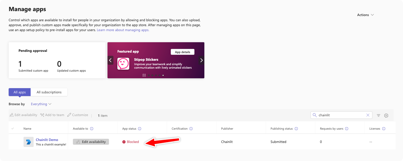 The Bot will have to be authorized by the Teams admin before it can be used. To do so navigate to the Teams admin center and find the app.