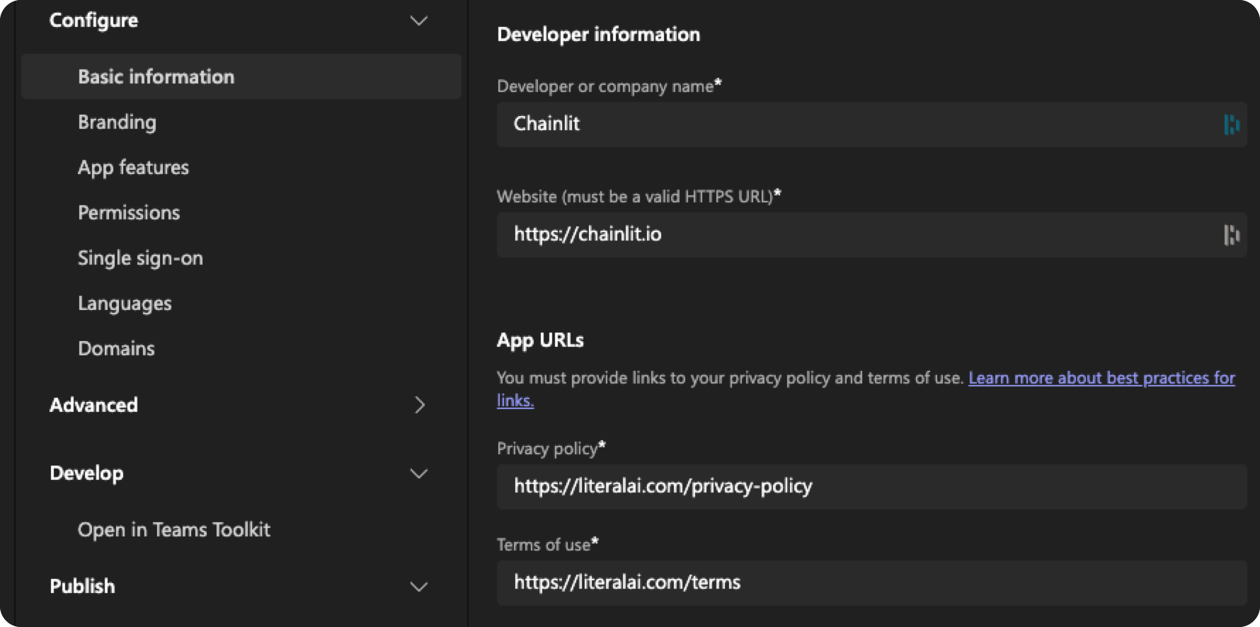 Navigate to Configure > Basic Information and fill in the basic information about your app. You won’t be able to publish your app until you fill in all the required fields.