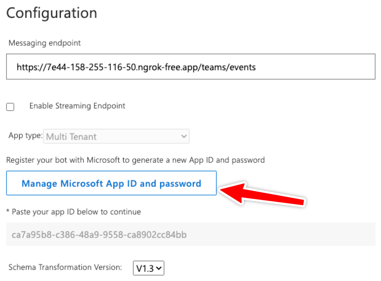 On the same page, you will find a blue “Manage Microsoft App ID and password” button. Click on it.
