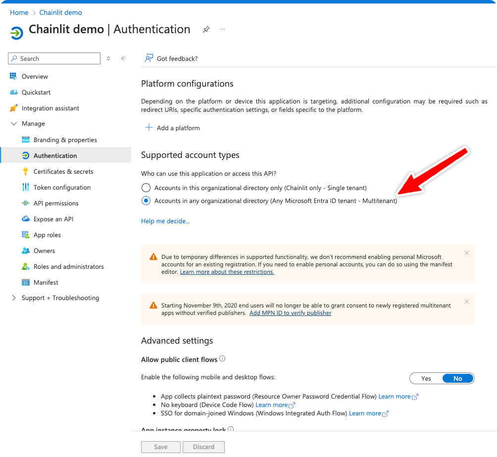 Navigate to Manage > Authentication and toggle “Accounts in any organizational directory (Any Microsoft Entra ID tenant - Multitenant)” then save.