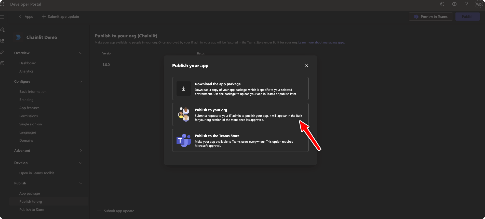 Back to the App Management page, navigate to “Publish to org” and click on “Publish”.